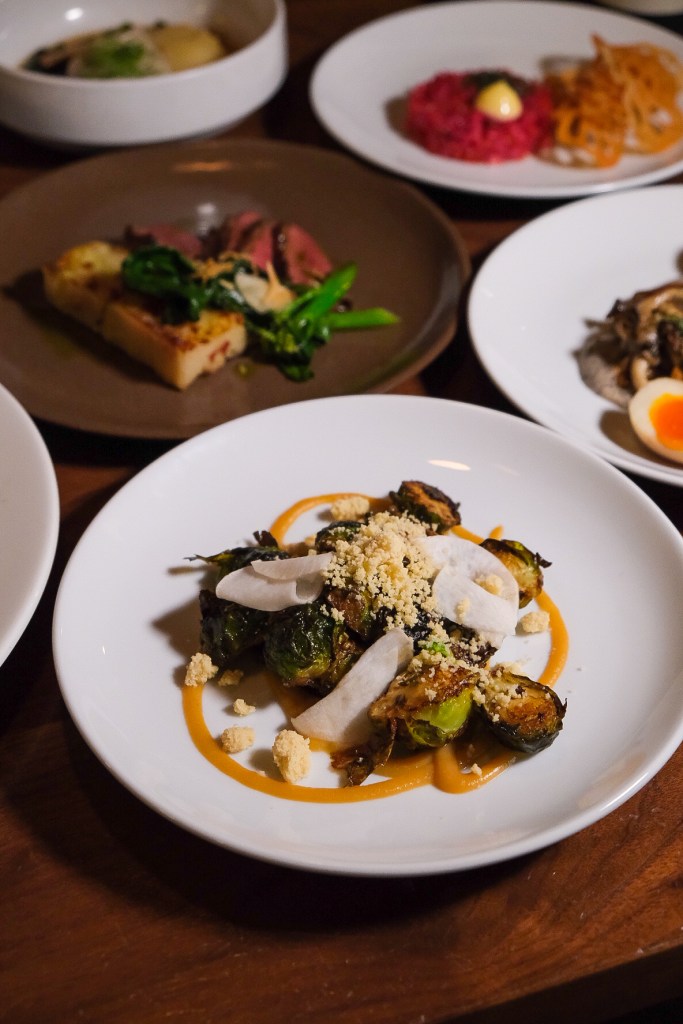 Fried brussel sprouts and pickled turnips, miso dressing, fennel and caraway salt, brown butter crumb