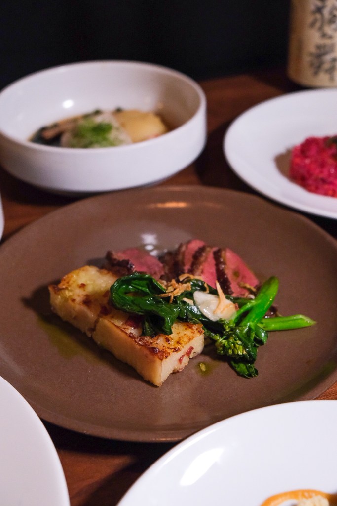 Magret duck breast citrus hoi sin glaze, radish cake with confit gizzards, chinese green with shaoxing