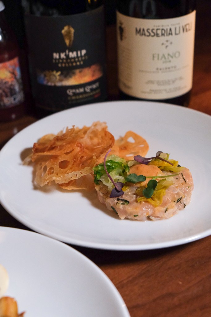 This dish was my favourite of the night because the slight tangy flavour of the beets with the mirepoix (a.ka. the Holy Trinity or onions, celery, and bell peppers) had a sherry like flavour and it opened my tastebuds and appetite for more food. Each vegetable was diced perfectly and there were no criticisms for the lotus chips!