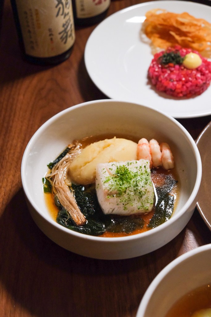 Seafood dashi halibut, prawns shoyu dashi, mashed potato, wakame, enoki mushroom, braised daikon