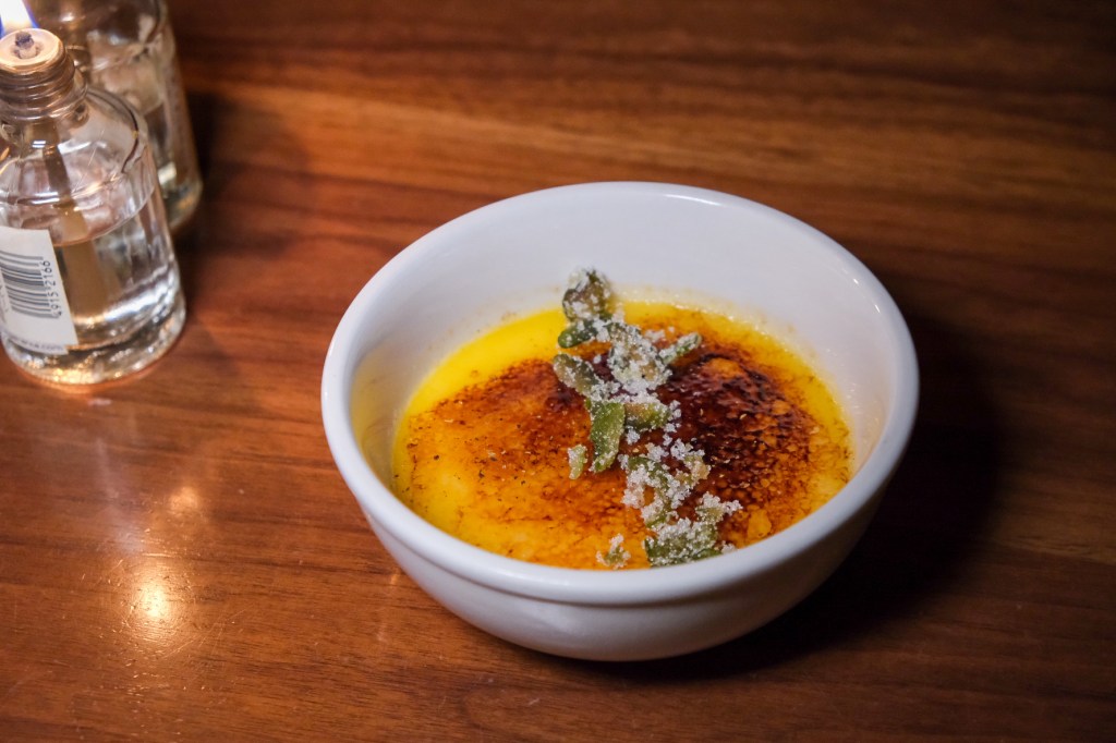 Yuzu Creme Brulee, sudachi pepper, candied castelvetrano olives
