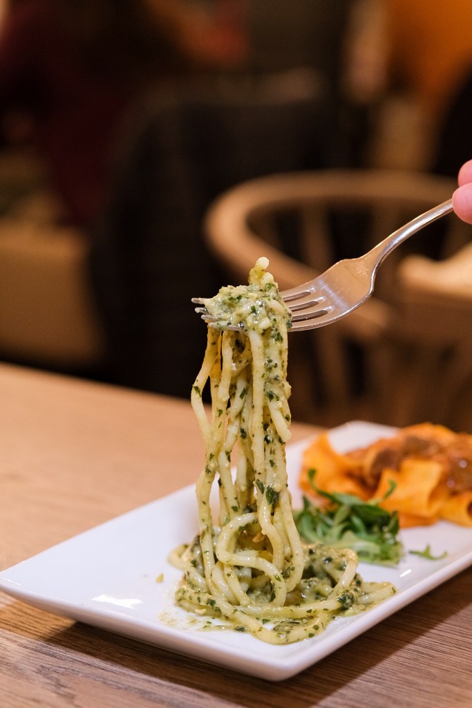 I absolutely loved the Spaghetti with a Southern Italian Pesto because the basil was fresh and abundant. The spaghetti was al dente and had a slight large diameter so it coated the sauce more and made me feel very full.