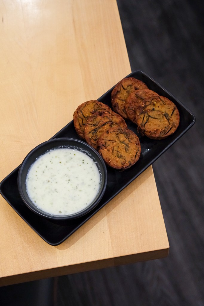 It comes with a grated garlic, ginger, buttermilk sauce and it gives a nice texture to the spinach disk. It isn’t a luscious one as you see the grated ginger fibres but it helps give the disks some “moisture.”