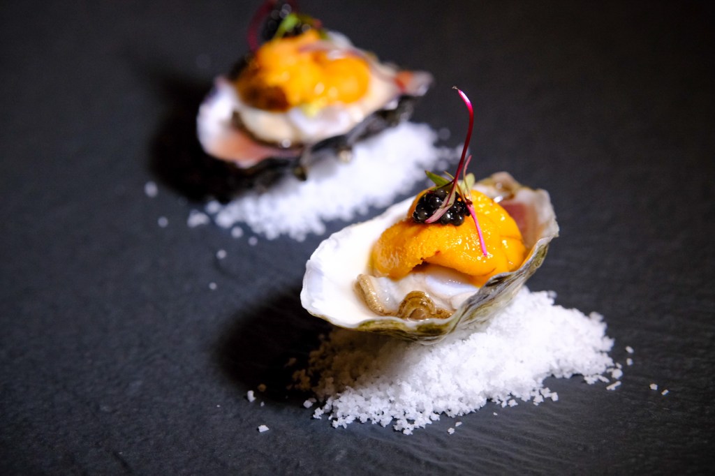 The Sun Seeker oysters are paired with a bold, umami and creamy uni and delicate cavier. A generous douse of citrus was added and a hint of heat.