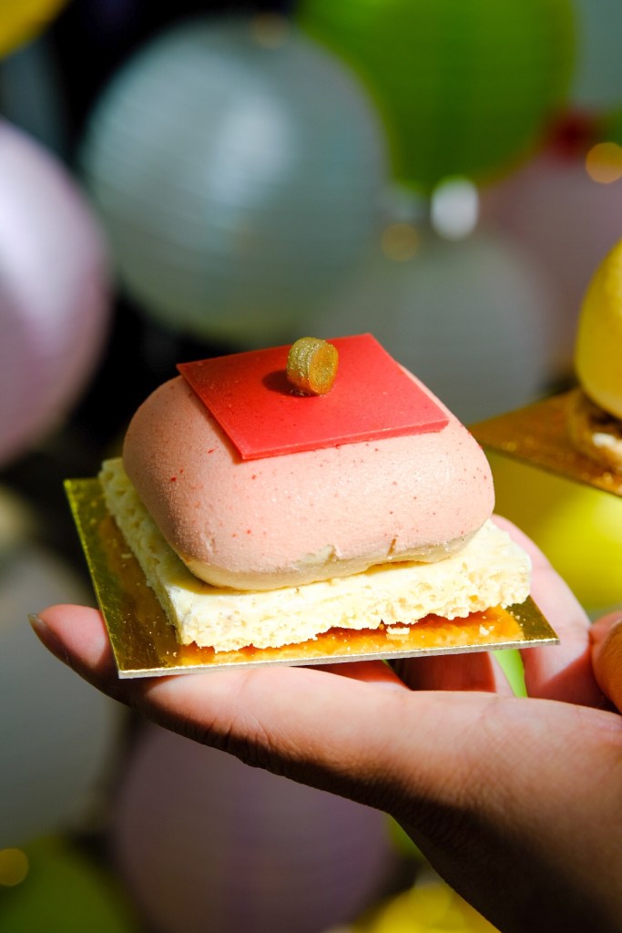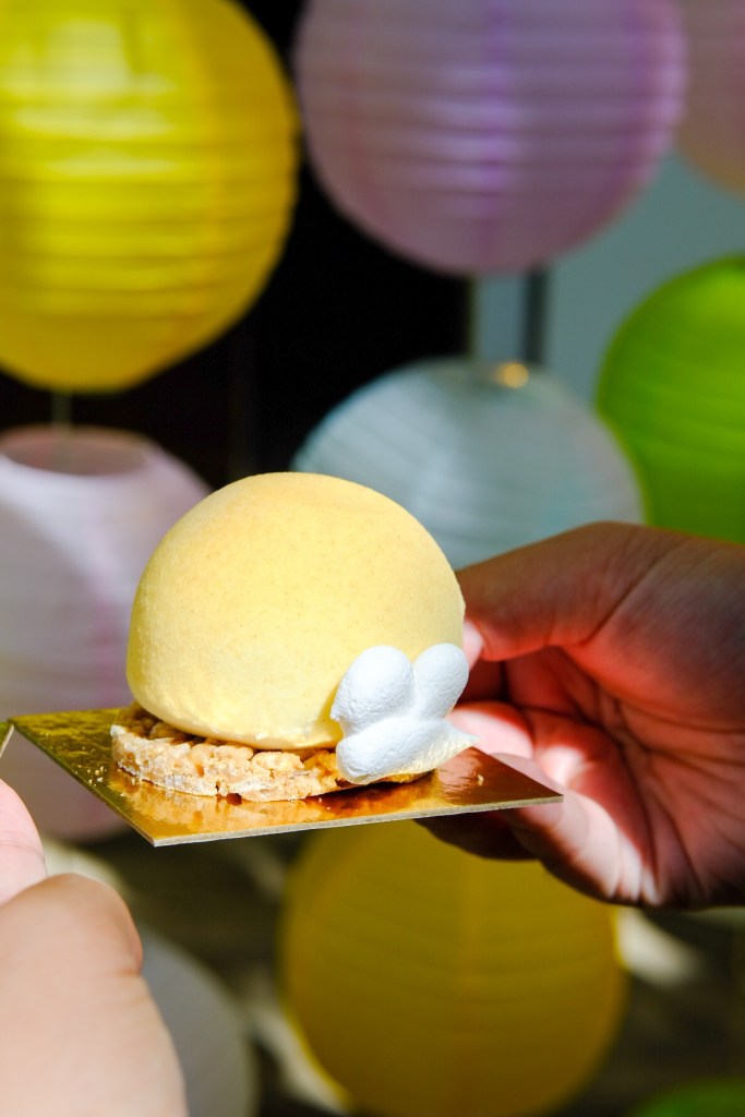 Shaped like the moon with the classic cloud swirl meringue, this mousse cake had a strong coconut flavour and vibrant pandan cake on top of a Rice Krispie base. The mango gelee centre was fruity and is the obvious choice for a coconut pandan dessert.